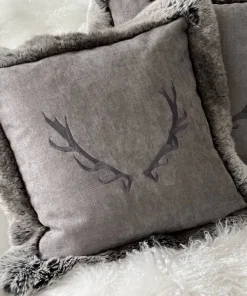 Edles besticktes Chalet Kissen Hirschgeweih mit Webpelz Fell grau 40×60 cm