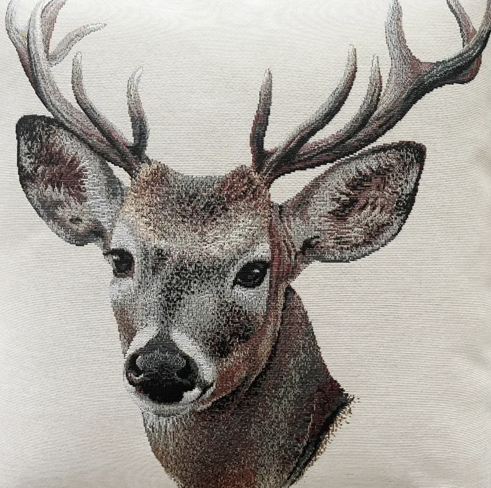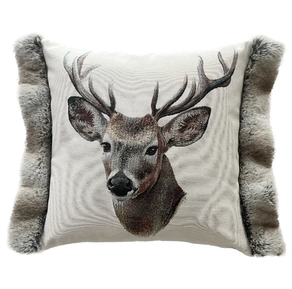 Edles individuelles Chalet Kissen in beige braun mit Hirschkopf Hirschgeweih-Motiv auf Gobelin-Stoff, seitlich wird das Kissen mit einer buschiger weichen Webpelzkante eingefaßt. Dadurch wirkt das Kissen noch eleganter. Zum Kuscheln schön. Sie werden sich in dieses Kissen verlieben. Alles Handarbeit. Ob Landhaus, Hüttenstil, modern Stil oder Chalet Stil. Ob als Einzelstück im Sessel oder mehrere zusammen auf dem Sofa, wo Sie es auch dekorieren, mit diesem Kissen haben Sie in Ihrer Wohnung einen absoluten Hingucker.