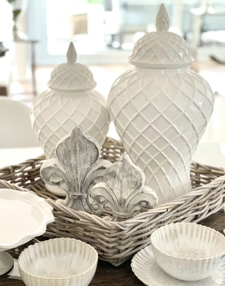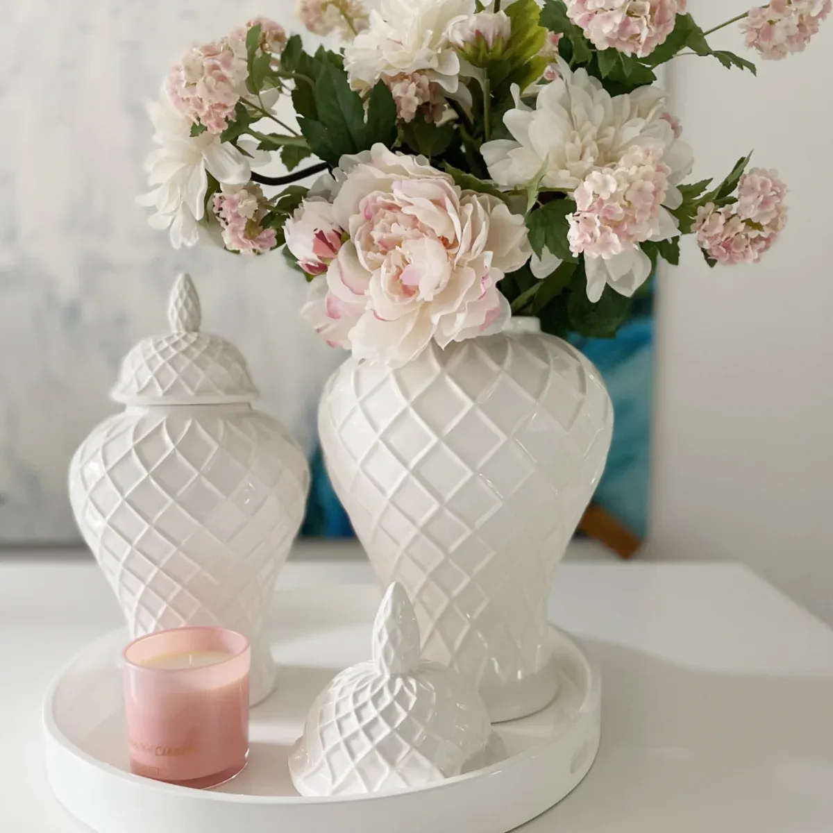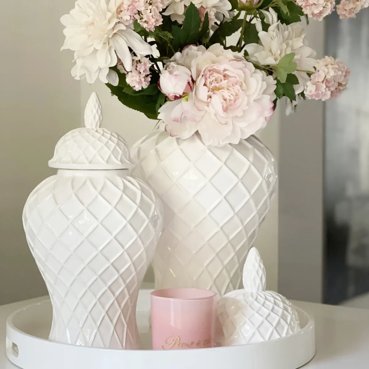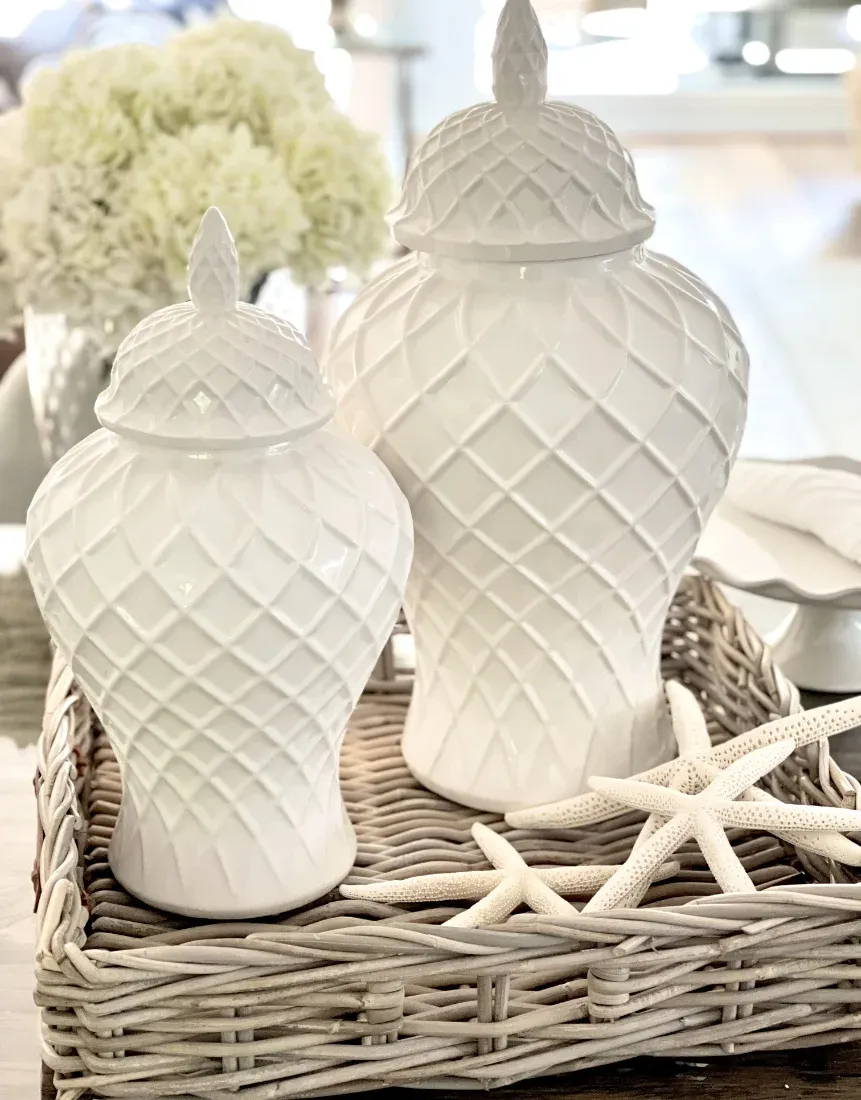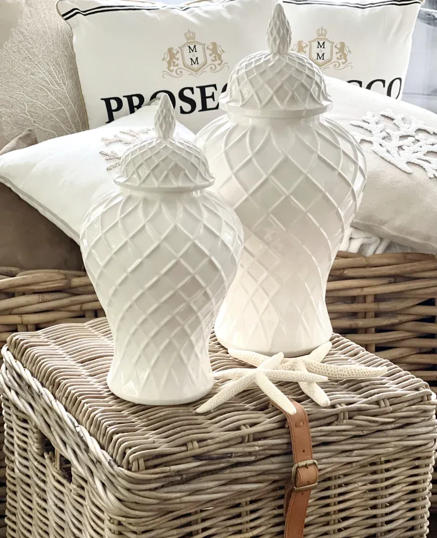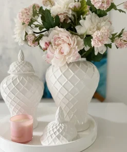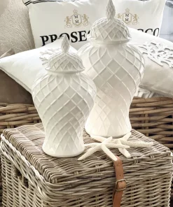 Eine sehr ausgefallene Deckelvase aus Keramik in weiß glasiert mit einem sehr schickem Rautenmuster. Diese edle Vase wirkt gerade wegen Ihrer Schlichtheit sehr exklusiv. Von sehr modern, Luxus und Shabby chic kann diese Vase in jeder Wohn-Einrichtung eingesetzt werden und setzt ihre Dekoration in Szene. Sie werden diese Deckelvase lieben.