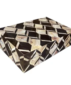Das edle hochwertige handgefertigte stilvolle längliche Box mit einem sehr hübschen braun beige schwarz Muster aus Hornstücken sorgt für glanzvolle Akzente in Ihrer Einrichtung. Eine wunderschöne Box für staubfreie Aufbewahrung von wichtigen Utensilien. Die Box bietet Platz für kreative Ideen wie z.B. als Ablage für Ihren Schmuck und Bad-Utensilien im Badezimmer oder auf der Konsole für Schlüssel.