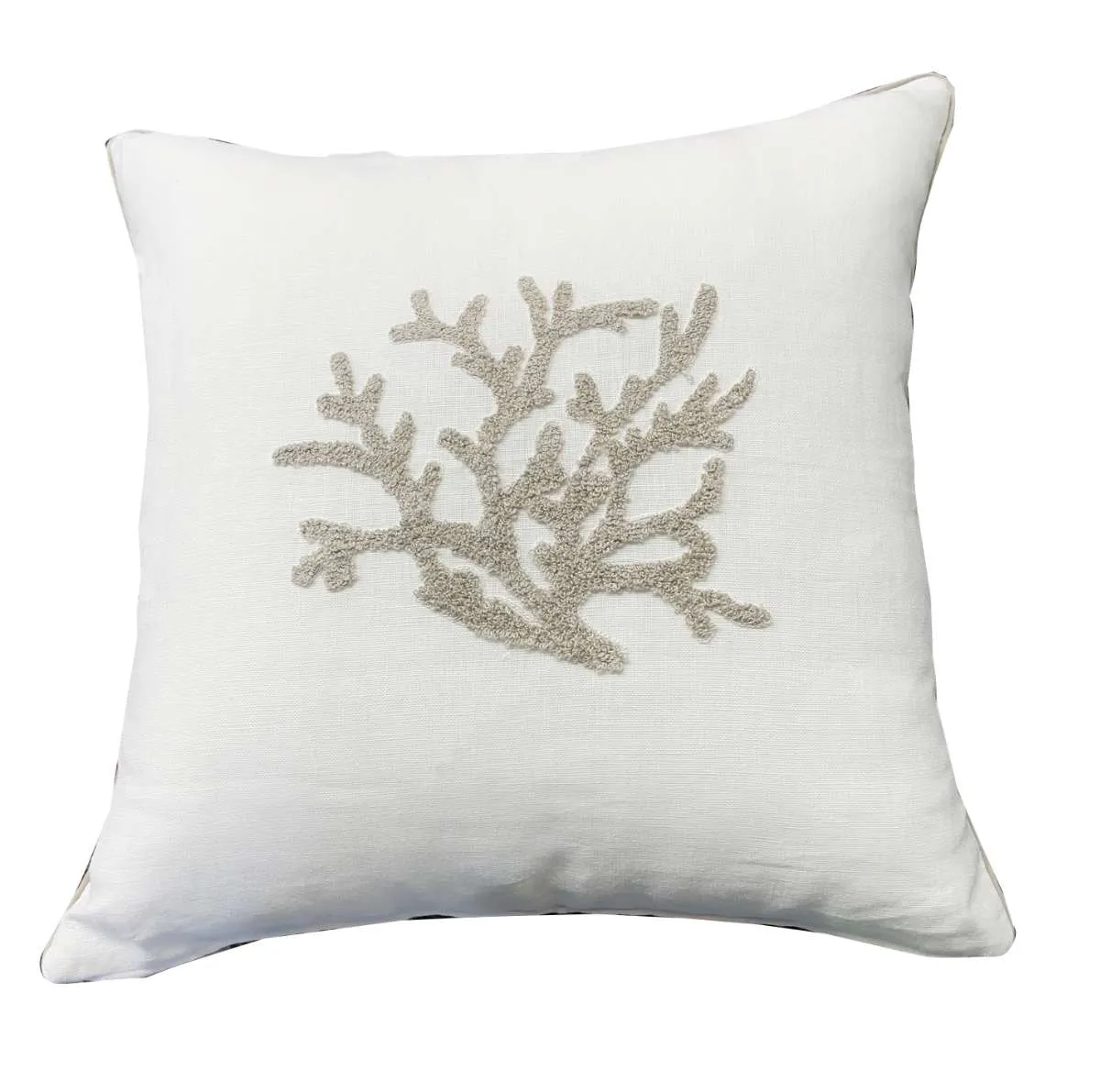 Sehr schönes individuelles Kissen, Dekokissen Leinenkissen im sommerlichen Design. Edles Leinenkissen in weiß mit einem besticktem großflächigem Korallen-Dekor im edlem beige. Ein Keder in beige faßt das Kissen wie eine Umrahmung ein. Dadurch wirkt das Kissen noch eleganter.