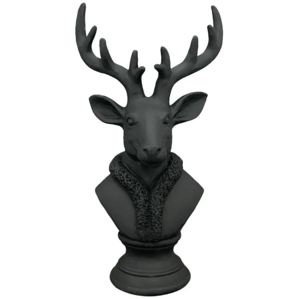 Eine wunderschöne Hirschbüste Hirschkopf auf Fuß ein Traum von einer Hirschbüste stilvoll und edel ausschauend. In schwarz chic mit einem Kragen bekleidet. Eine edle Hirschfigur für den Herbst und Weihnachtsdekoration. Ob auf dem Fenstersims, Anrichte oder für den wunderschönen gedeckten Tisch, diese Figur ist ein absoluter Hingucker. Blick nach vorne schauend.