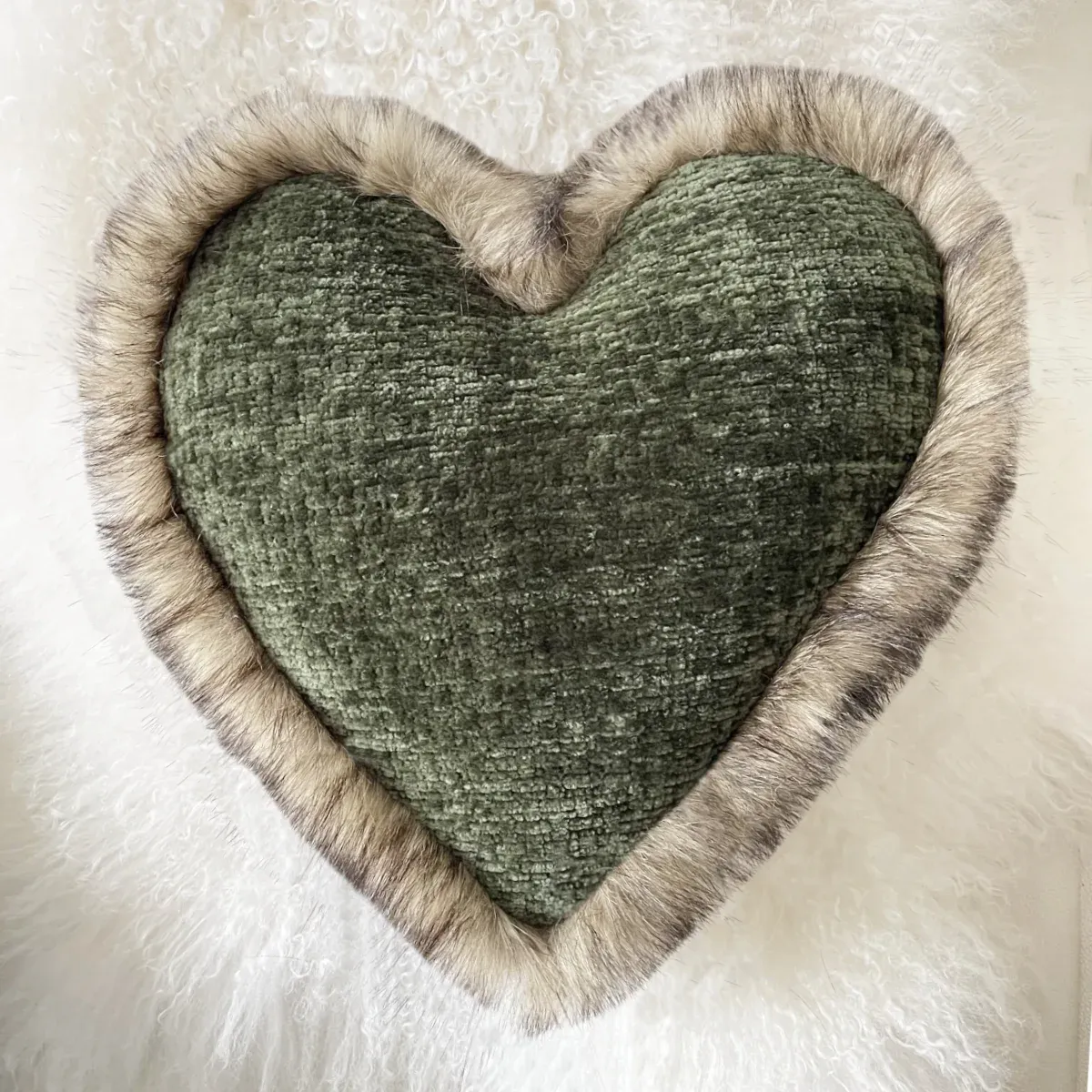 Kuscheliges Herzkissen in Samt grün schimmernd, seitlich wird das Kissen mit buschiger weicher Webpelzkante eingefaßt. Dadurch wirkt das Kissen noch eleganter und zum kuscheln schön. Sie werden sich direkt in das Herzkissen verlieben.