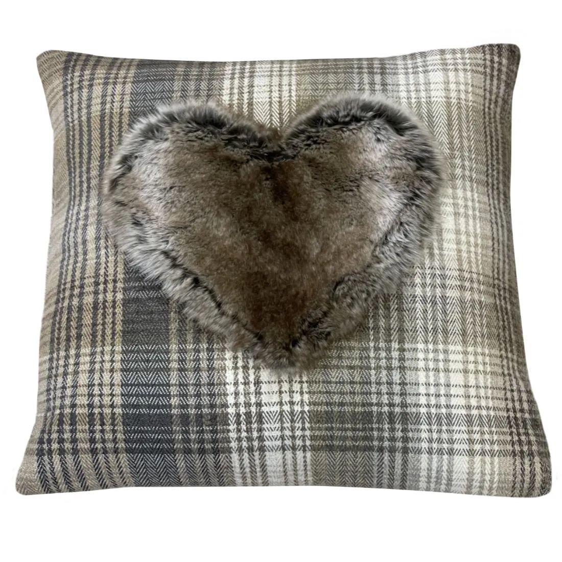 Chalet Herzkissen in Karo braun beige grau. In der Mitte ziert ein Herz aus Webpelz das Kissen. Dadurch wirkt das Kissen zum kuscheln schön. Sie werden sich direkt in das Chalet-Herzkissen verlieben. Ob als Einzelstück im Sessel oder mehrere zusammen auf dem Sofa, mit diesem Kissen haben Sie in Ihrer Wohnung einen absoluten Hingucker. Holen Sie sich ihr Chalet-Herz-Kissen in Ihr Heim. Da geht einem das Herz auf. Ein tolles herzliches Geschenk. Der Hersteller Steen Design begeistert mit immer wieder neuen Designs in kreativer Vielfalt und auch mit höchsten Ansprüche an Qualität und Fertigung. Alles Handarbeit. Jedes Kissen ein Unikat. Entworfen wird Stück für Stück. Die Herstellung der Meterware erfolgt in Europa und konfektioniert wird ausschließlich in Deutschland. Ein wunderschönes Wohn-Accessoire. Für moderne, lebensfrohe Wohn-Textilien, die frische Akzente setzen und luxuriösen Komfort bieten.