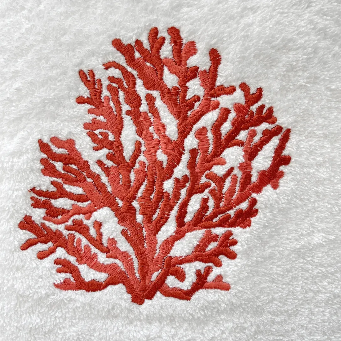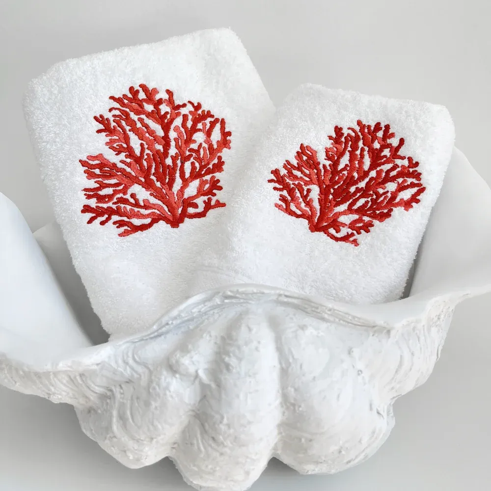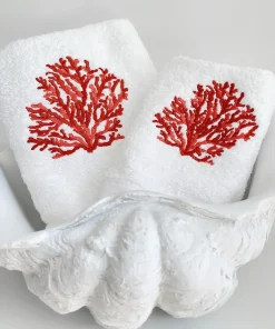 Edles Handtuch und Gästetuch bestickt mit einer Korallein rot auf 100% edler Baumwolle.