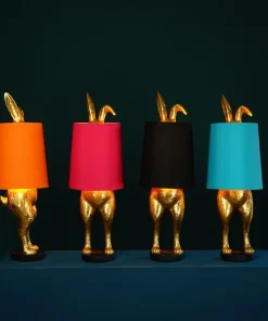 Eine luxuriöse sehr edle Tisch- oder Stehlampe, Dekolampe in gold in Form von einem Hasen mit schwarzem Lampenschirm. Die Lampe in gold, elegant und sehr ausgefallen. Diese Stehlampe ist ein echter Eyecatcher. Das Gestell eines stehendem Hasen, der nur den Blick auf die Beine und Ohren erlaubt. Der Rest verbirgt sich hinter dem schwarzem Lampenschirm. Eine extravagante Lampe nicht nur für die Osterzeit. Setzen Sie einen tollen starken, stylischen Akzent in Ihren Wohnraum. Der Lampenschirm aus Stoff in schwarz, das gibt ein sehr warmes Licht ab und wirkt sehr luxuriös. Eine Lichtquelle, die für Gemütlichkeit sorgt. Die Lampe überzeugt mit einer luxuriösen Gestalt. Egal ob auf der Anrichte oder einem Beistelltisch im Wohnzimmer, oder im Eingangsbereich im Flur auf einem Sockel – diese traumhafte Design-Stehlampe ist vielseitig nutzbar und paßt in vielen Stilrichtungen. Wo Sie auch diese Stehlampe dekorieren – ein wahrer Hingucker. Sie werden diese Lampe lieben.