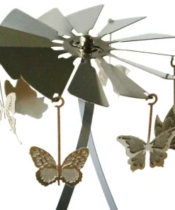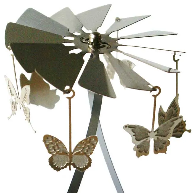 Lieferumfang: Teelicht Karusell, bestehend aus einem Ständer, einem Flügelrad und Anhänger zum Thema Schmetterling. Die Metallteile sind sehr fein und filigran gefertigt aus hochwertigen Federstahl